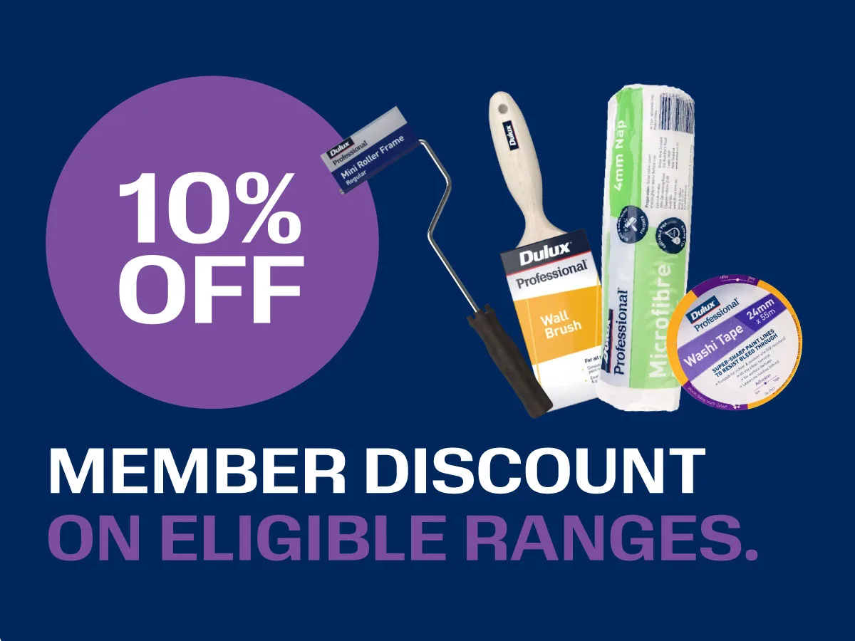 DuluxTrade Rewards Members enjoy an always-on 10% off full priced eligible product ranges—in Dulux Trade Centres only!