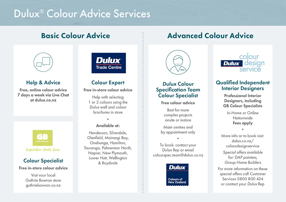 Download a summary of the Colour Advice Services on offer here or pick up a postcard from your nearest Dulux Paint Centre.