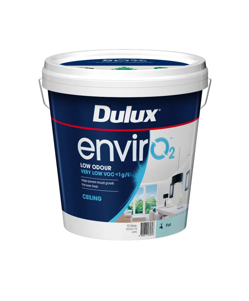 Dulux envirO2™ Ceiling Flat is a very low VOC and low odour premium paint specifically designed for use on ceilings. It contains mould protection to help prevent mould growth. It has high opacity and a flat finish to help hide minor surface imperfections.