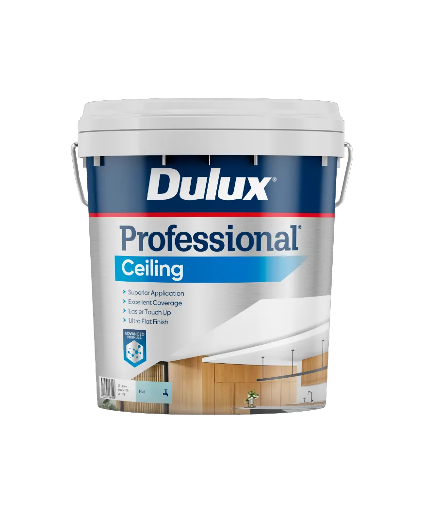 NEW Dulux Professional Ceiling Flat-White has an ultra-flat sheen level for an exceptional finish. It has advanced formula for superior, smooth, low spatter application and excellent coverage for superior hiding power. Dulux Professional Ceiling has improved wet edge time and is easier to touch-up, which helps deliver a uniform finish. It is low odour and low VOC. Dulux Professional® Ceiling Flat has added mould resistance that helps protect in humid environments.