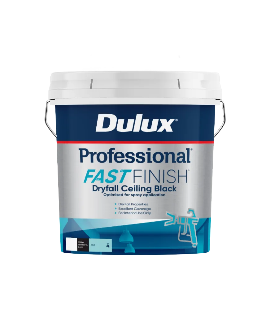 Dulux Professional® FASTFINISH™ Dry Fall Ceiling is a flat premium acrylic ceiling paint designed specifically for spray application. Formulated with dry fall properties, it is suitable for interior ceilings and overhead surfaces. When applied to ceilings of minimum three metres in height, the Dry Fall paint dries to a powder when the overspray particles reach the floor, allowing for easy clean up.