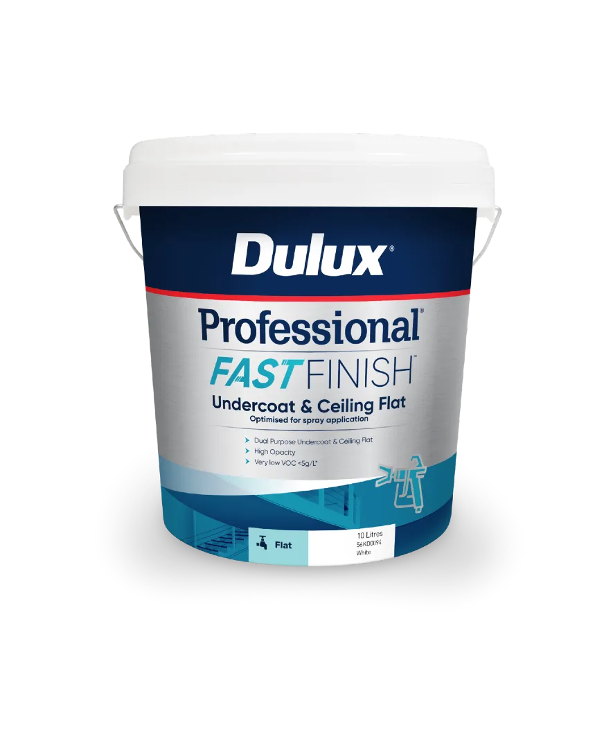 Dulux Professional® FASTFINISH™ Undercoat and Ceiling Flat is a high quality, dual purpose interior paint that is designed to save time by undercoating walls and topcoating ceilings without stopping.