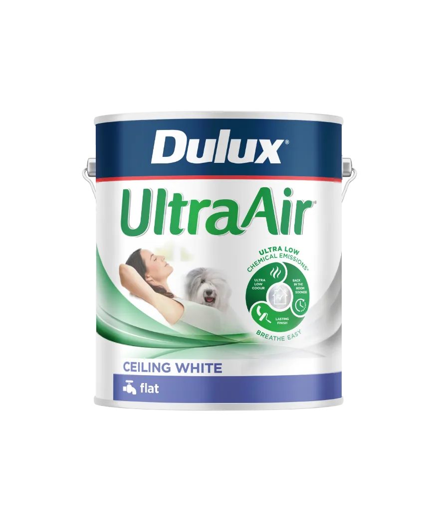 Dulux UltraAir® Ceiling White is an ultra-low chemical emissions*, ultra-low odour premium water-based paint. Proven to emit fewer chemical emissions*, Dulux UltraAir® maintains your indoor air quality. It's a whole-of-home product that is recommended for use in conjunction with Dulux UltraAir® Primer and Dulux UltraAir® Interior wall products to achieve an ultra-low chemical emissions system. Dulux UltraAir® is GREENGUARD Gold certified and Global GreenTag™ GreenRate™ Level A and PlatinumHEALTH™ certified. Dulux UltraAir® can contribute to the achievement of Green Star and WELL project certifications. So take a deep breath, relax and enjoy your great indoors.