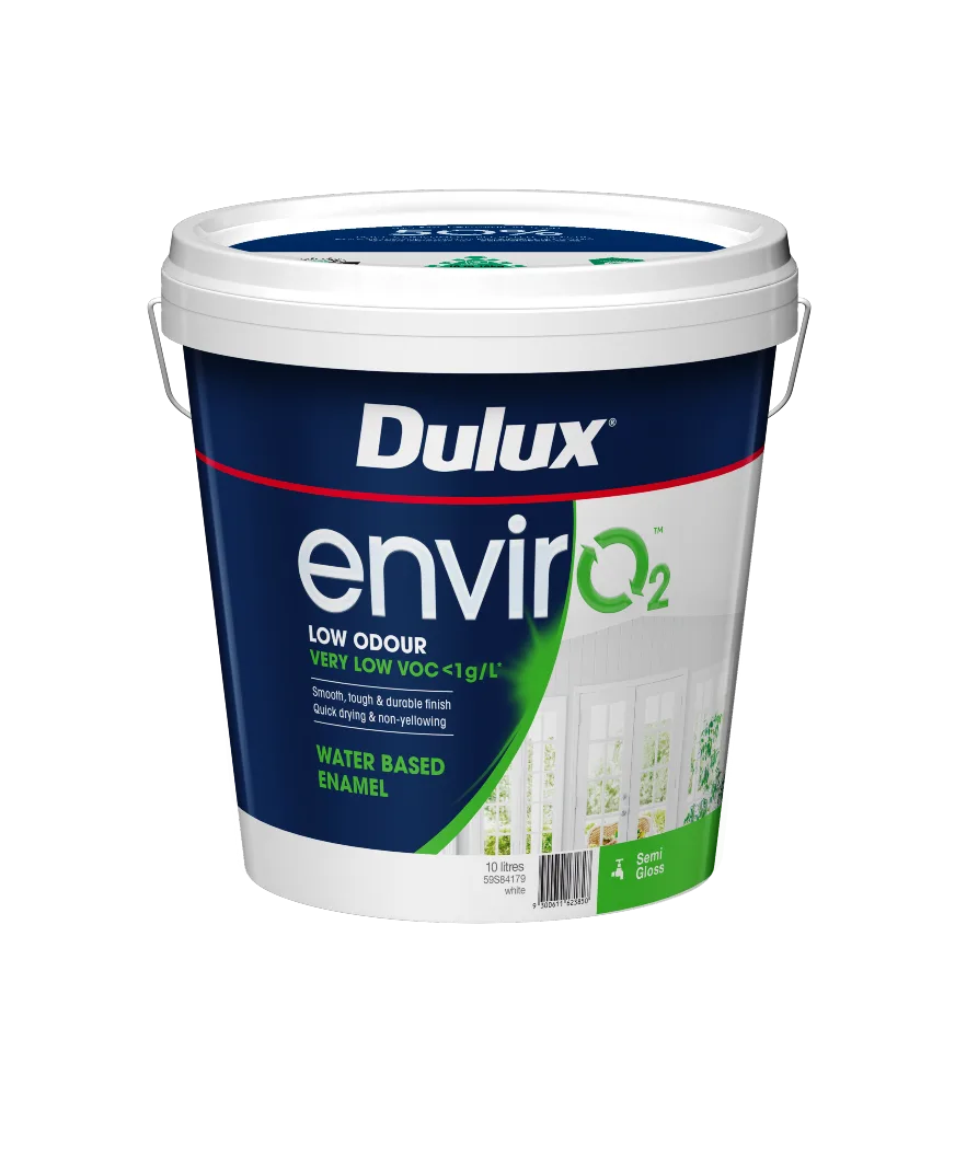 Dulux envirO2™ Water Based Enamel Semi Gloss is a very low VOC and low odour interior premium paint for use on doors, windows and trims. It produces a non-yellowing, tough and durable finish that is washable and stain resistant.