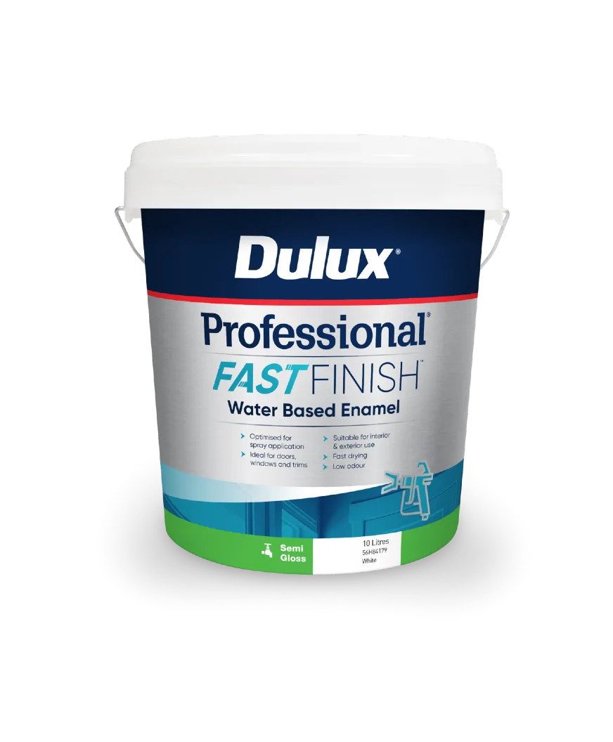 Dulux Professional® FASTFINISH™ Water Based Enamels are premium acrylic products suitable for use on interior and exterior doors, window frames and trim. They are a great alternative to traditional oil-based enamels with the benefits of using an acrylic paint.