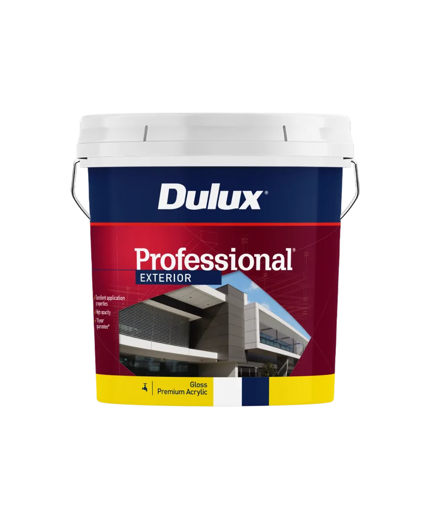 Dulux Professional® Exterior is 100% acrylic Gloss with excellent application and opacity. It is suitable for use on exterior surfaces such as masonry, cement render, brick, fibro cement, suitably primed timber and metal (except roofing).