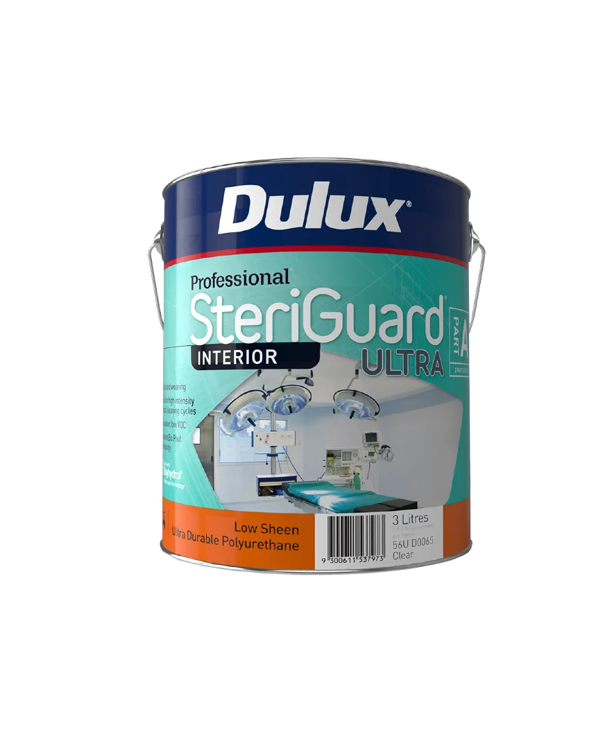 Dulux Professional® SteriGuard® Ultra is a two-part durable polyurethane that when mixed, uses Bayhydrol® water-based technology from Covestro to produce an ultra-tough interior finish designed to withstand high intensity cleaning cycles in clinical environments. The low VOC, low odour formula ensures quick return to service with less disruption. It contains Bio-Pruf™ Technology, allowing it to withstand clinical cleaning cycles, therefore assisting in the protection against mould and mildew growth, helping to keep surfaces clean and help maintain good interior air quality.