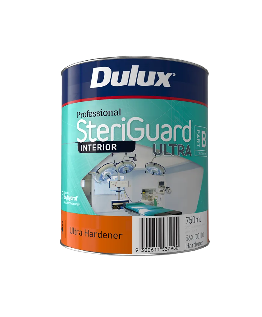 Dulux Professional® SteriGuard® Ultra is a two-part durable polyurethane that when mixed, uses Bayhydrol® water-based technology from Covestro to produce an ultra-tough interior finish designed to withstand high intensity cleaning cycles in clinical environments. The low VOC, low odour formula ensures quick return to service with less disruption. It contains Bio-Pruf™ Technology, allowing it to withstand clinical cleaning cycles, therefore assisting in the protection against mould and mildew growth, helping to keep surfaces clean and help maintain good interior air quality.