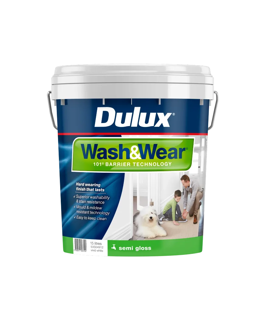 Dulux Wash&Wear® Semi Gloss provides a mid-level sheen that works well on all walls including frequently cleaned areas and wet areas or as an alternative to enamels on doors and skirting boards. The hard-wearing finish allows you to wipe away most common marks, scuffs and stains with a wet cloth so your walls will look freshly painted for years.