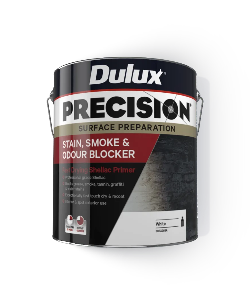 Dulux PRECISION® Stain, Smoke & Odour Blocker is the professionals choice for a fast-drying superior stain blocker. It blocks a wide range of stubborn water and oil-based stains such as grease, smoke, tannin, graffiti and water. It also protects against tannin bleed in timber and seals odours.