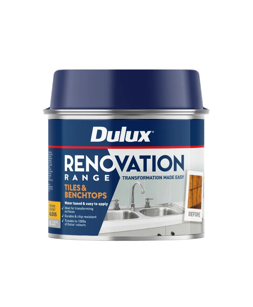 Dulux Renovation Range Tiles & Benchtops is a revolutionary, water-based interior coating that is perfect for surfaces in the kitchen, bathroom and laundry. It is easy to apply and provides a beautiful, durable, scratch, chip and scuff-resistant finish that you can achieve yourself.