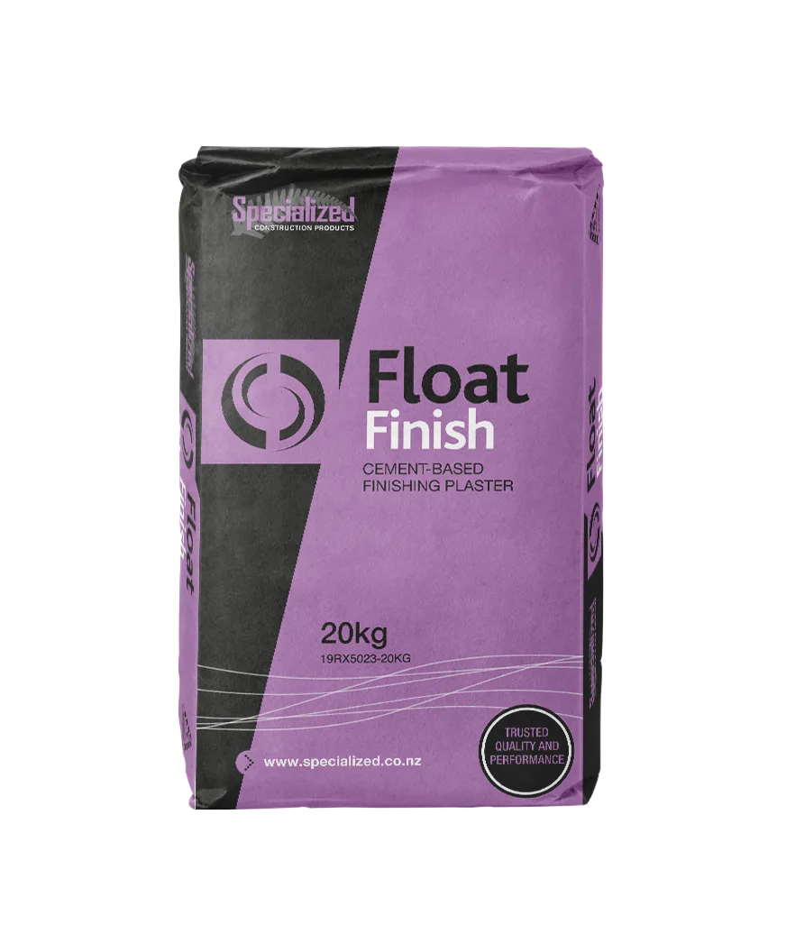 MIXING: Add approximately 5.5 litres of clean water to a clean bucket and then while stirring slowly add the 20kg bag of Float FInish. Float Finish should be mixed with with a heavy duty electric drill powering a high shear stirrer at approximately 600 r.p.m. The product should be mixed for a minimum of 2 minutes or long enough to provide a smooth lump-free blend. The consistency should be such that the material holds its shape when a finger is run through the surface. Let the mix stand for 5 minutes and give it a quick re-stir before application and adjust the final consistency.