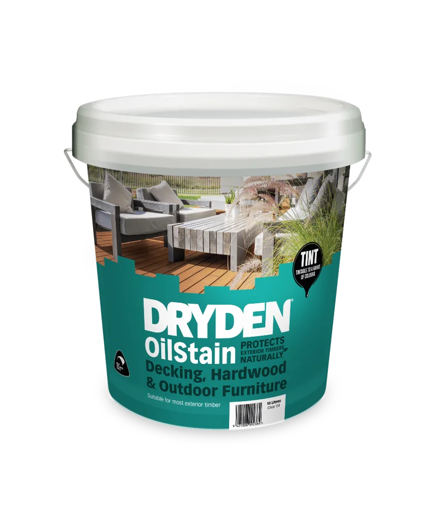 Dryden OilStain is a deeply penetrating oil that nourishes most exterior timber species. Dryden OilStain nourishes and protects from within to help timber last longer. It is water resistant to help minimize warping, cupping, and splitting which occur from water getting into the timber.Use for protecting outdoor wood furniture and most exterior wood joinery, suitable for application on: Decking, hardwood timber screening, outdoor furniture, windows, doors, plywood\/timber, beams, fascia boards, shutters, joinery, fences, posts and engineered products. Dryden OilStain can be applied to most species of timber, old, new, rough, or smooth.To get your desired colour, you can add Dryden Colourtone+ to Dryden OilStain. Adding Dryden Colourtone+ can also give a longer lasting finish and added UV protection. Or if you want to keep your natural timber colour, Dryden OilStain has a clear finish that will allow the timber to gradually fade overtime to a natural grey or with simple maintenance, maintain your timber’s natural colour.Dryden OilStain is formulated to never flake, blister, or peel as a film isn’t being formed, instead the oil penetrates the timbe