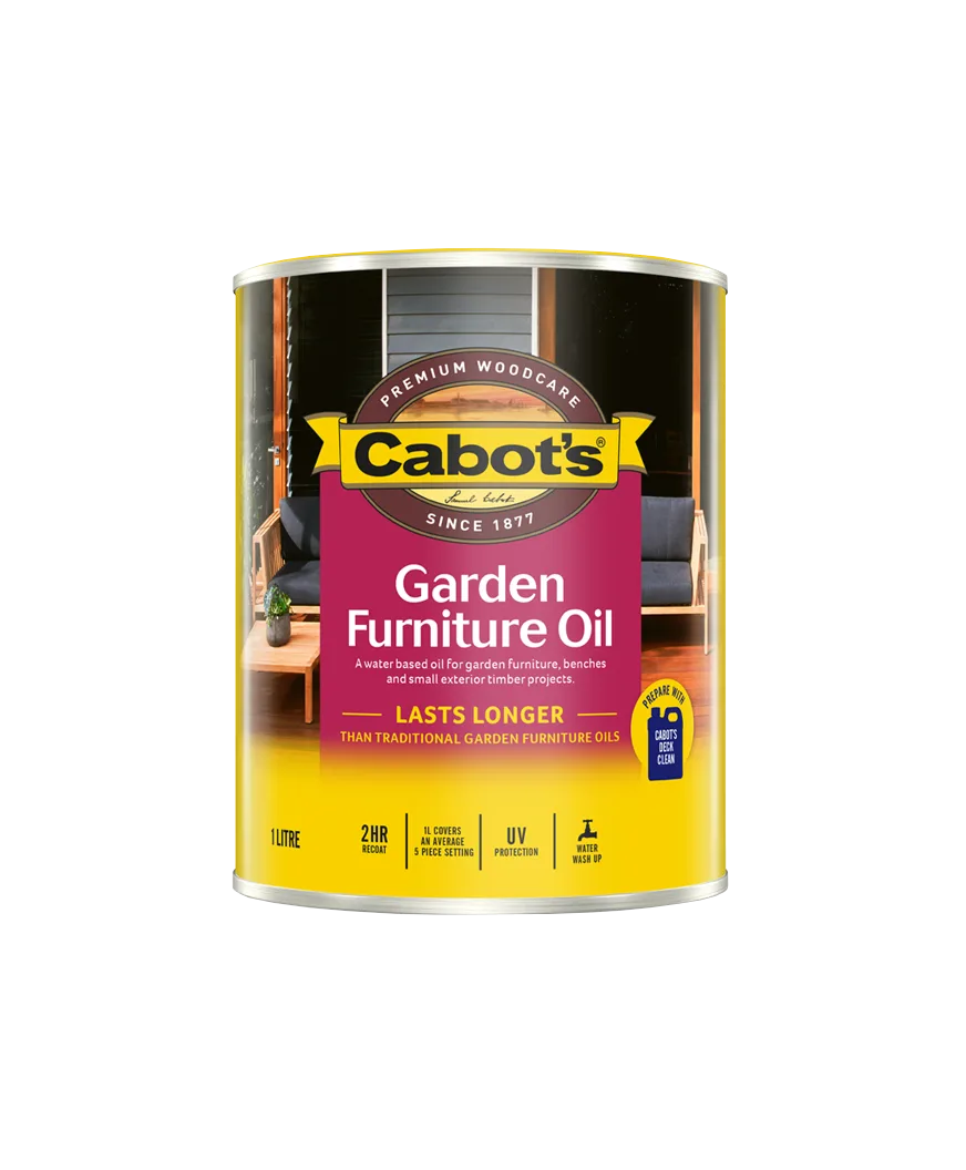 Cabot's Garden Furniture Oil Water Based is a highly durable, low odour exterior oil. It isdesigned to provide exceptional durability to garden furniture, BBQ trolleys and benches andlasts longer than traditional garden furniture oils. Garden Furniture Oil Water Based's advanceddual technology allows natural oils to penetrate and nourish the timber, then creates a durableacrylic barrier for a beautiful natural finish.