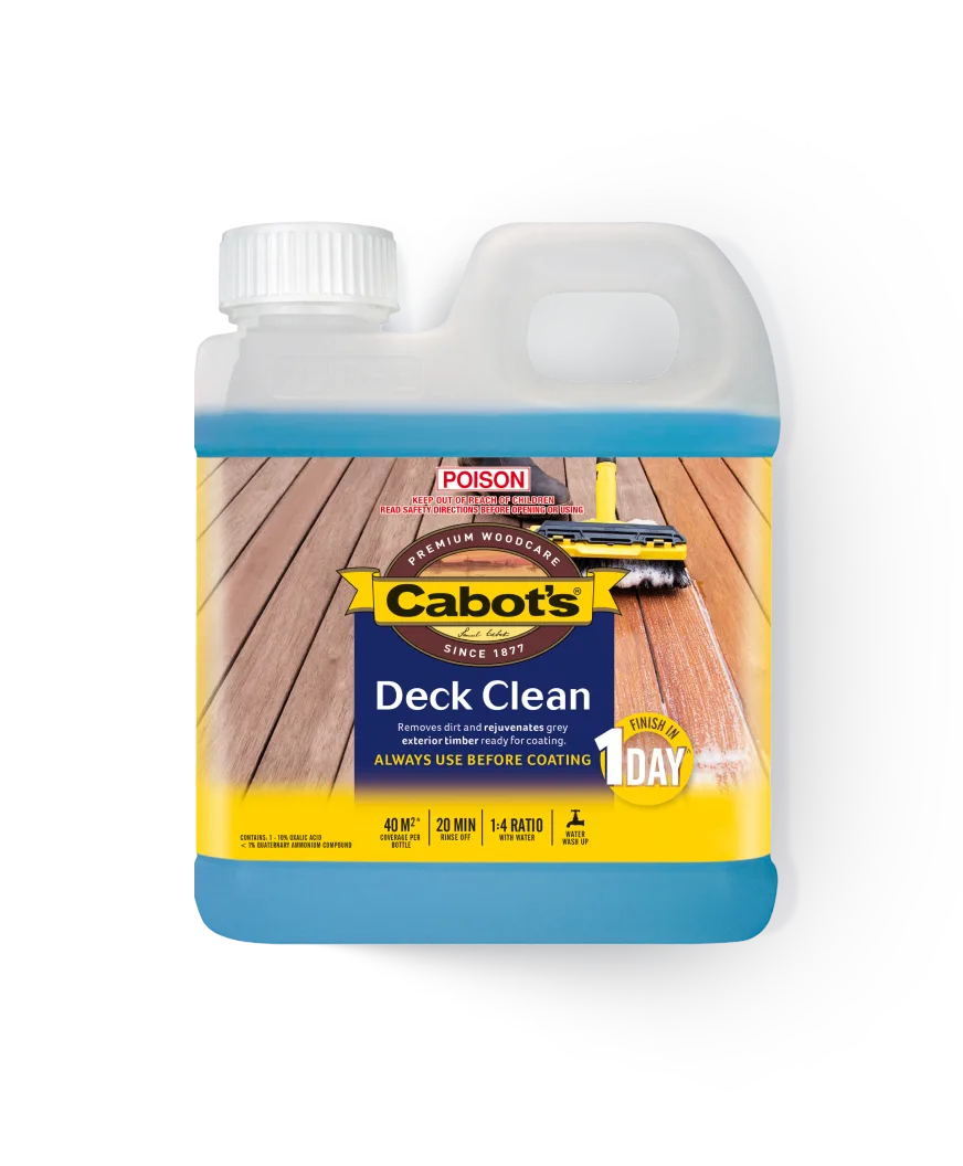 Cabot's Deck Clean is an essential preparation product that cleans and rejuvenates new andold exterior timber surfaces prior to applying a top coat of oil, stain, paint or exterior varnishes.It is designed to revitalise and clean grey, weathered and soiled timber and removes naturallyoccurring tannins from new timber. It is also effective in removing mould and othercontaminants.