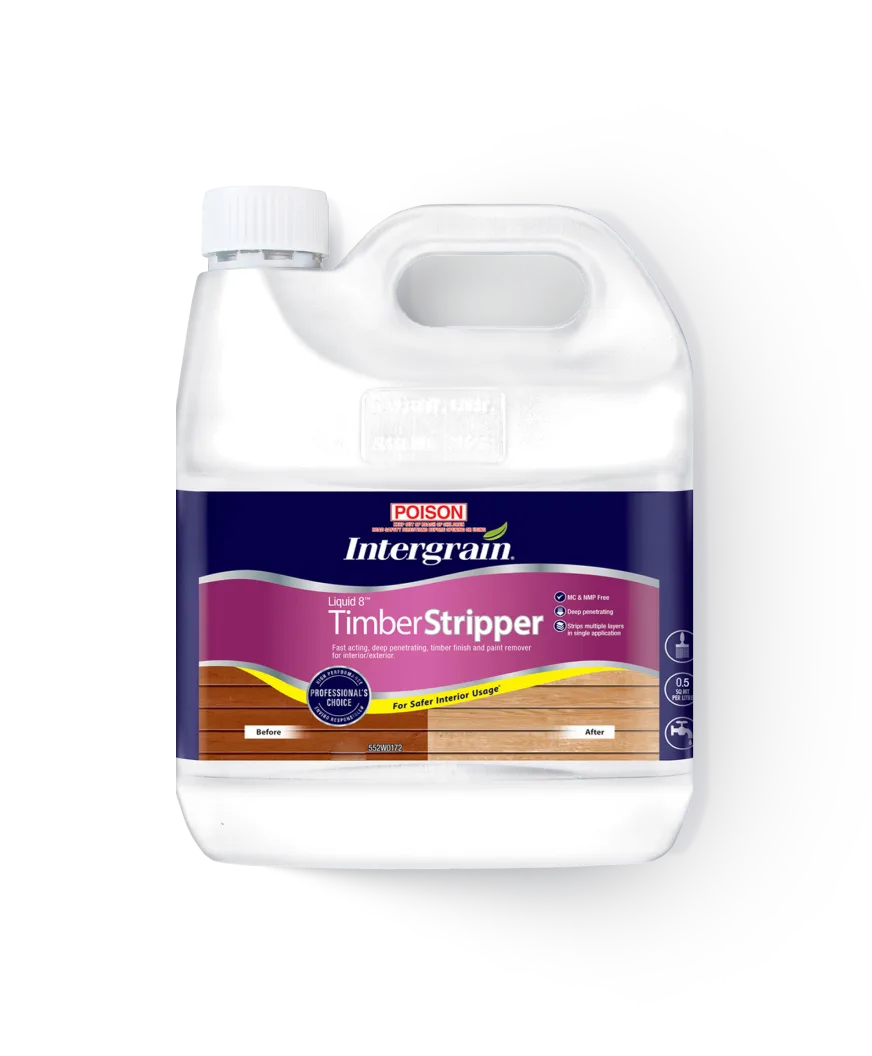 Intergrain Liquid 8 Timber Stripper is a fast acting, easy to use, water soluble gel timber finish and paint remover. Liquid 8 Timber Stripper is suitable for interior and exterior application. The N-Methylpyrrolidone (NMP) and Methylene Chloride (MV)+ Free formula has been specifically developed for safer interior usage. With excellent softening and deep penetration that allows multiple layers to be stripped in a single application, Liquid 8 Timber Stripper quickly and effectively removes most water and oil based timber coatings including acrylics, polyurethanes and varnishes. Note: Not suitable for epoxies and 2-Pack oil based coatings. Environmentally responsible Liquid 8 Timber Stripper is free from Methylene Chloride and NMP which are found in most traditional paint and varnish strippers. This makes Liquid 8 Timber Stripper safer for interior usage, and gentler on the environment when compared to these traditional strippers.